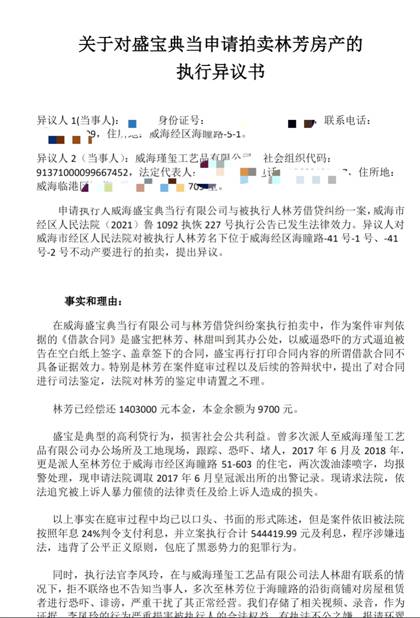 【瑾玺针对盛宝典当威海经区法院案件中造假合同执行异议部分内容】