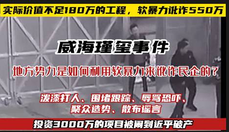 威海瑾玺事件,揭露出了一段黑装修联合高利贷及村痞恶霸的地方势力,以软暴力为主要手段,对企业进行长时间、持续不间断的“围剿”,将民企闹倒后,通过其背后的“保护伞”在威海公检法内部组成的利益集团来拍卖企业资产来超额获利。