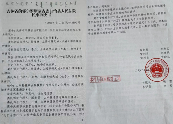 前郭县法院经开庭审理,于2020年12月29日作出(2020)吉0721民初3890号民事判决,驳回诉讼。华服公司和合作社不服,上诉至松原市中级法院,松原中院于2021年8月4日作出的(2021)吉07民终635号民事判决,维持原判。