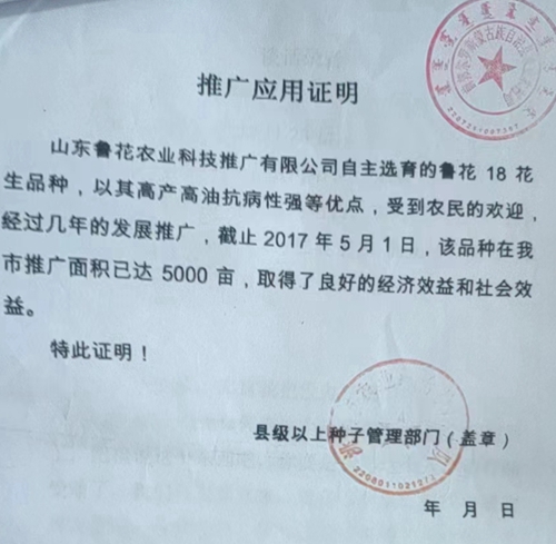 华服公司和合作社农户们还指控鲁花公司涉嫌伪造推广证明骗取农业部登记证书:2017年9月5日,尹建辉(鲁花公司种子销售员)谎称为了明年区域推广应用的需要,骗取华服公司田间管理人员,在其种植的涉案种子收货之前,为其提供伪造的推广证明,洮南市农业执法大队在其推广证明上加盖了公章,鲁花公司在山东种子站备案,2018年4月23日取得了农业农村部非主要农作物品种登记证书。其实,鲁花花生在洮南市根本未达到5000亩,取得了良好经济效益和社会效益纯粹是编造的谎言。