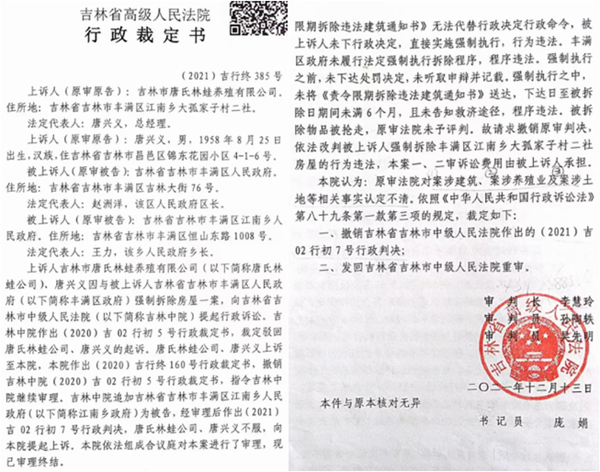 2021年12月13日,接到上诉状的吉林省高级法院经审理认为:原审法院对案涉建筑、案涉养殖业及案涉土地等相关事实认定不清,再次裁定撤销判决,发回重审。