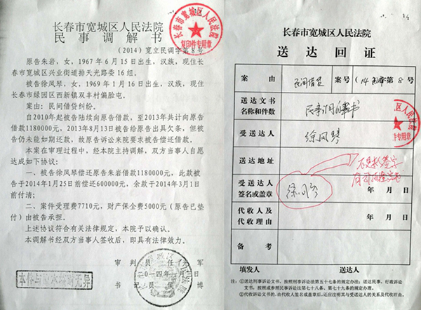 2013年12月28日,朱岩等人凭借此“欠据”,将徐凤琴告至法院,宽城区法院于2014年1月3日立案,承办法官牟春阳、任光军于2014年1月3日14时在伊通县鼎盛华府小区工地制作民事调解笔录,并“达成”协议,内容为:被告徐凤琴偿还原告朱岩借款118万元,此款被告于2014年1月25日前偿还60万元,余款于2014年3月1日前付清;二、案件受理费7710元,财产保全费5000元(原告预付)由被告负担。