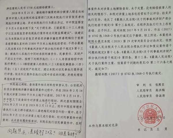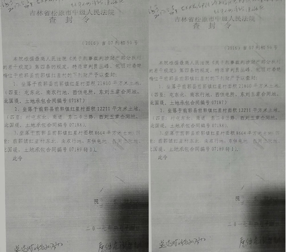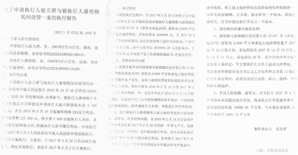 在实名举报的同时,赵立群给媒体提供了案件承办人张京孝的执行报告(《关于申请执行人赵立群与被执行人潘艳梅民间借贷一案的执行报告【(2017】吉0702执1068号)。该报告称:“本案争议的潘艳梅与前郭镇红星村签订的07187号《养殖业承包合同》面积为21800平方米承包土地经营权查封问题作如下说明,这块土地的经营权首封是松原市公安局宁江二分局,查封日期为2016年2月14日至2017年2月13日,查封期限一年,这其中中法于2016年9月14日轮候查封,公安局宁江二分局查封逾期后没有续封,中院轮候查封变成首封,经申请执行人申请,本院进行评估和拍卖。”