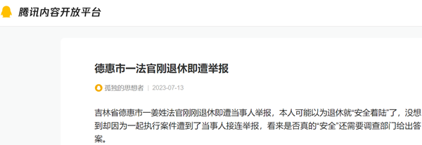 吉林省德惠市一姜姓法官刚刚退休即遭当事人举报,本人可能以为退休就“安全着陆”了,没想到却因为一起执行案件遭到了当事人接连举报,看来是否真的“安全”还需要调查部门给出答案。