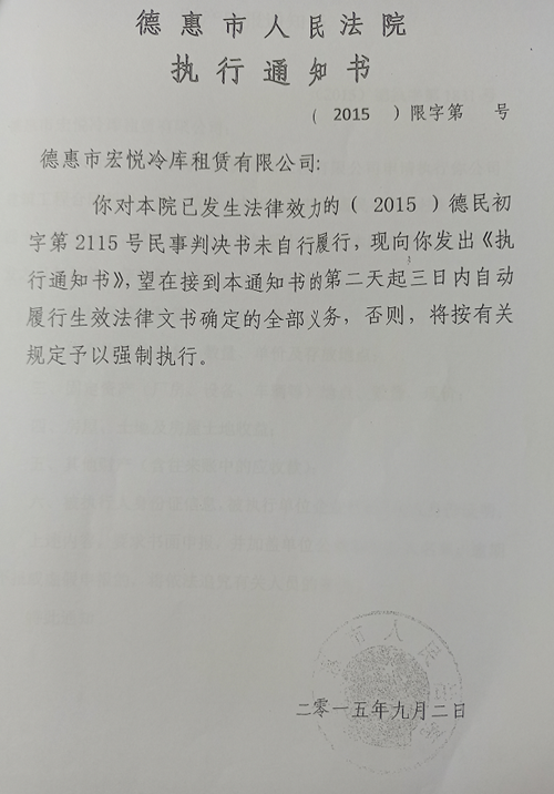 2015年9月2日,负责执行的法官姜春明向宏悦公司发出(2015)德执字第1831号《财产申报通知书》,同时发出(2015)限字第号《执行通知书》,执行通知书写明“望在接到本通知书的第二天起三日内自动履行生效法律文书确定的全部义务,否则,将按有关规定予以强制执行。”