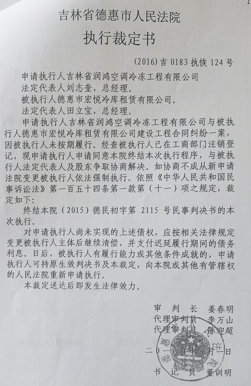 德惠法院于2016年10月25日作出了(2015)德执字第10795号《执行裁定书》称,”由于清算时没有书面通知申请执行人吉林省润鸿空调冷冻工程有限公司“,裁定:”变更第三人田宝立、肖英为本案被执行人“。