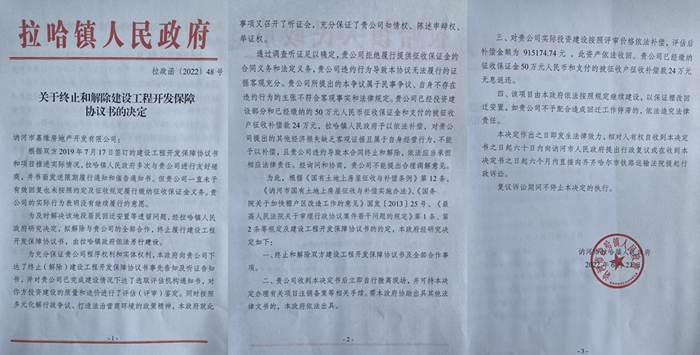 拉哈镇政府做出的《拉哈镇人民政府关于终止和解除建设工程开发保障协议书的决定》(拉政函【2022】48号)则称:“根据双方2019年7月17日签订的建设工程开发保障协议书和项目推进实际情况,拉哈镇人民政府多次与贵公司进行友好磋商,并书面发送限期履行通知和催告通知书。但贵公司一直未予有效回复也未按照约定及征收规定履行缴纳征收保证金义务。贵公司的实际行为表明没有继续履行的意愿。为及时解决该地段居民回迁安置等遗留问题,经拉哈镇人民政府研究决定,拟解除与贵公司的全部合作,终止履行建设工程开发保障协议书,由拉哈镇政府依法另行建设。”