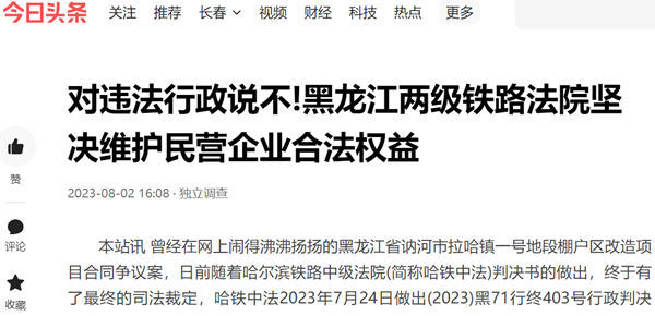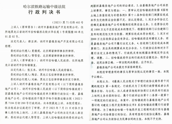 本站讯 曾经在网上闹得沸沸扬扬的黑龙江省讷河市拉哈镇一号地段棚户区改造项目合同争议案,日前随着哈尔滨铁路中级法院(简称哈铁中法)判决书的做出,终于有了最终的司法裁定,哈铁中法2023年7月24日做出(2023)黑71行终403号行政判决书,终审再次判决拉哈镇政府违法。对此,民营企业家、嘉缘公司老板郝亚洲拍手称快,他激动的说:“近年来,党中央、国务院一再强调要切实保护民营企业,我还不敢相信。黑龙江两级铁路法院做出如此公正的判决,坚决维护了民营企业的合法权益,让我看到了民营企业的希望!”