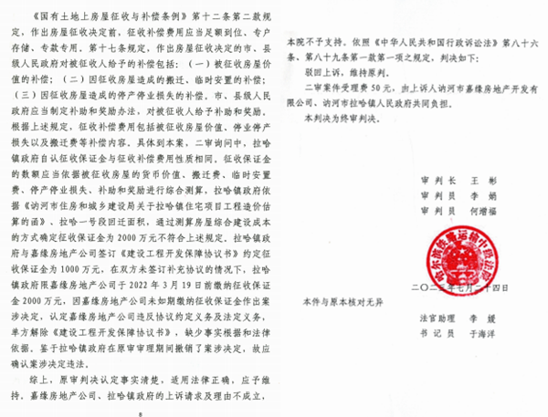 此判决做出后,拉哈镇政府不服,提出上诉,嘉缘公司也提出上诉。但是最终均被哈铁中法驳回。哈铁中法的(2023)黑71行终403号行政判决书称:“本院认为......本案中,拉哈镇政府与嘉缘房地产公司签订的《建设工程开发保障协议书》系拉哈镇政府履行行政管理职能,为了确保拉哈镇一号地段开发工程顺利进行而与嘉缘房地产公司协商签订的协议,具有明显的行政协议属性,嘉缘房地产公司认为该协议为民事合同的主张,本院不予支持。《国有土地上房屋征收与补偿条例》第十二条第二款规定,作出房屋征收决定前,征收补偿费用应当足额到位、专户存储、专款专用。第十七条规定,作出房屋征收决定的市、县级人民政府对被征收人给予的补偿包括: (一) 被征收房屋价值的补偿; (二) 因征收房屋造成的搬迁、临时安置的补偿;(三)因征收房屋造成的停产停业损失的补偿。市、县级人民政府应当制定补助和奖励办法,对被征收人给予补助和奖励。根据上述规定,征收补偿费用包括被征收房屋价值、停业停产损失以及搬迁费等补偿内容。具体到本案,二审询问中,拉哈镇政府自认征收保证金与征收补偿费用性质相同。征收保证金的数额应当依据被征收房屋的货币价值、搬迁费、临时安置费、停产停业损失、补助和奖励进行综合测算,拉哈镇政府依据《讷河市住房和城乡建设局关于拉哈镇住宅项目工程造价估算的函》、拉哈一号段回迁面积,通过测算房屋综合建设成本的方式确定征收保证金为2000万元不符合上述规定。拉哈镇政府与嘉缘房地产公司签订《建设工程开发保障协议书》约定征收保证金为1000万元,在双方未签订补充协议的情况下,拉哈镇政府限嘉缘房地产公司于2022年3月19日前缴纳征收保证金2000万元,因嘉缘房地产公司未如期缴纳征收保证金作出案涉决定,认定嘉缘房地产公司违反协议约定义务及法定义务,单方解除《建设工程开发保障协议书》,缺少事实根据和法律依据。鉴于拉哈镇政府在原审审理期间撤销了案涉决定,故应确认案涉决定违法。综上,原审判决认定事实清楚,适用法律正确,应予维持。嘉缘房地产公司、拉哈镇政府的上诉请求及理由不成立。”
