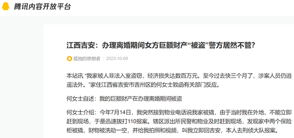 据了解,7月14日案发后,何女士及时报了案,辖区派出所民警和物业也及时赶到现场,并现场做了拍照和视频,让她立即回吉安,本人去刑侦大队报案。7月16日凌晨,何女士赶回吉安后,按要求先去辖区派出所做笔录。下午派出所民警谢某某给她做了笔录,记录其“被盗”现金125万元,首饰价值几十万元,另有房产证和毕业证等所有重要证件一并消失,另有何女士的钱包“被偷”,所有银行卡不翼而飞,包括笔记本电脑一台,所有经济损失达数百万元。做完笔录后,派出所将此案移交给区刑侦。但是次日,她再去刑侦补充材料时,就被告知不构成案件,理由是“偷盗者”跟何女士还在婚姻存续期间。然而,何女士却坚持说对方就是“盗窃”,而且情节十分严重,给她造成的损失巨大,一定要追究刑事责任。律师们也认为此案构成盗窃犯罪。她还曾向省公安厅做过咨询,省厅被咨询的领导也认为构成盗窃。