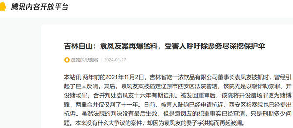 本站讯 两年前的2021年11月2日,吉林省乾一浓饮品有限公司董事长袁凤友被抓时,曾经引起了巨大反响。其后,袁凤友案被指定辽源市西安区法院管辖,该院先是以敲诈勒索罪、开设赌场罪,合并判处袁凤友十六年有期徒刑。被发回重审后,该院将开设赌场罪改为赌博罪,两罪合并仅仅判了十一年。日前,被害人陆钧已经申请抗诉,西安区检察院也已经提出抗诉。虽然法院的判决没有最后生效,但是袁凤友的犯罪事实已经查清,只是刑期多少问题。本来没有什么大争议的案件,却因为袁凤友的妻子宇洪梅而再起波澜。