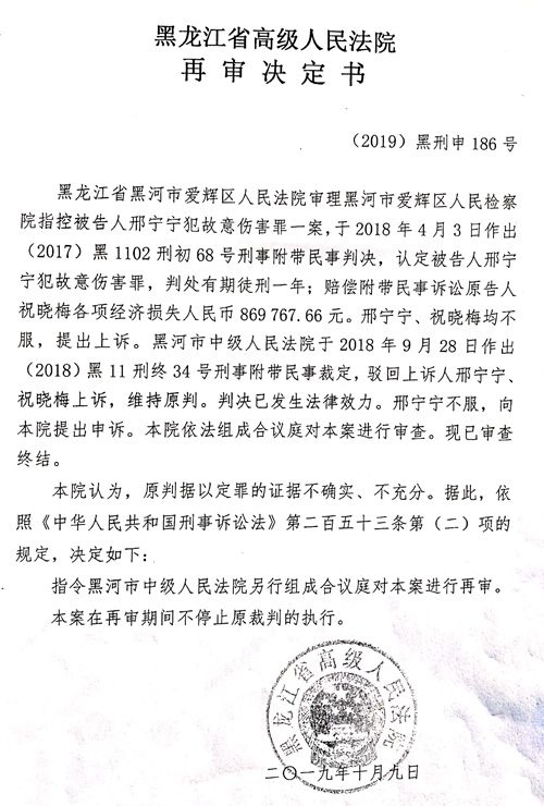邢宁宁依旧不服,遂向黑龙江省高级法院申诉。省高院于2019年10月9日作出(2019)黑刑申186号再审决定,称:“原判据以定罪的证据不确实、不充分”,指令黑河市中级法院另行组成合议庭对本案进行再审。2019年12月13日,黑河中院作出(2019)黑11刑再3号刑事附带民事裁定,该裁定称:“本院认为,本案原一审、二审据以定罪的案件事实不清,证据不确实、不充分,不能排除合理怀疑”,裁定撤销了本院的(2018)黑11刑终34号刑事附带民事裁定和爱辉区法院(2017)黑1102刑初68号刑事附带民事判决,发回爱辉区法院重新审判。