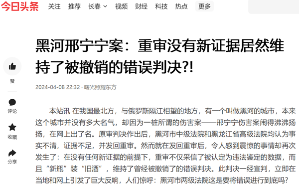 本站讯 在我国最北方,与俄罗斯隔江相望的地方,有一个叫做黑河的城市,本来这个城市并没有多大名气,却因为一桩所谓的伤害案——邢宁宁伤害案闹得沸沸扬扬,在网上出了名。原审判决作出后,黑河市中级法院和黑龙江省高级法院均认为事实不清,证据不足,并发回重审。然而就在发回重审后,令人感到震惊的事情却再次发生了:在没有任何新证据的前提下,重审不仅采信了被认定为违法鉴定的数据,而且“新瓶”装“旧酒”,维持了曾经被撤销了的错误判决。此判决一经宣判,立即在当地和网上引发了巨大反响,人们惊呼:黑河市两级法院这是要将错误进行到底吗?