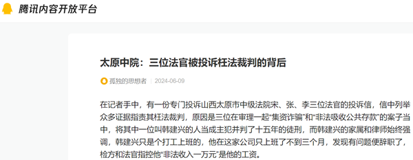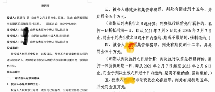 在记者手中,有一份专门投诉山西太原市中级法院宋、张、李三位法官的投诉信,信中列举众多证据指责其枉法裁判,原因是三位在审理一起“集资诈骗”和“非法吸收公共存款”的案子当中,将其中一位叫韩建兴的人当成主犯并判了十五年的徒刑,而韩建兴的家属和律师始终强调,韩建兴只是个打工上班的,他在这家公司只上班了不到三个月,发现有问题便辞职了,检方和法官指控他“非法收入一万元”是他的工资。