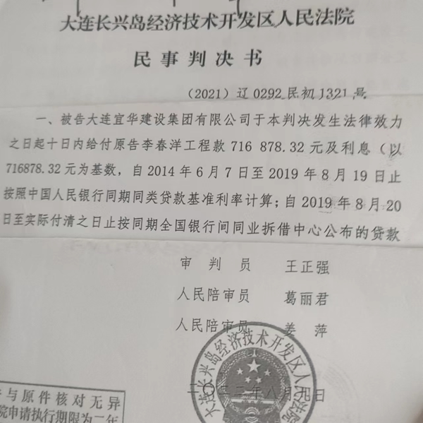这年,李先生从大连宜华建设集团手中承包了1.63亿元的建筑工程,因李先生手中没有公司,于是按以往合作的惯例,他与大连宜华双方签订了个《管理责任状》,责任状中明文规定,李先生要从自己所得中,支付给大连宜华10%的管理费。截止到2014年,李先生从大连宜华那里得到了1.04亿的工程款,也按双方的《管理责任状》,这1.04亿施工款在打给李先生时,要扣除这10%的管理费,实际上,到李先生帐上的只有9400万元。这样,大连宜华尚欠李先生5300万元,经多次索要无果,于是,李先生将大连宜华告上法庭。