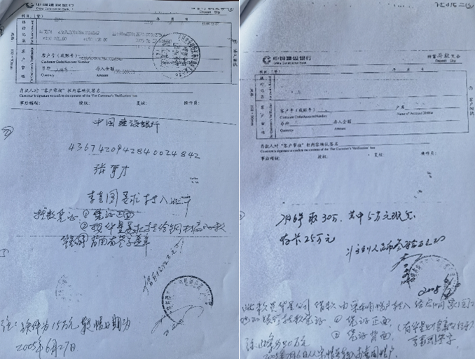 大约两年之久,翟与宋“找”出4份“新证据”向吉林省高检提出抗诉申请,这4份“新证据”是银行的“储蓄取款凭条”,凭条取款日期分别为:2005年6月23日“54万”、2005年6月23日“11万”、2005年6月27日“15万”、2005年7月6日“30万”。