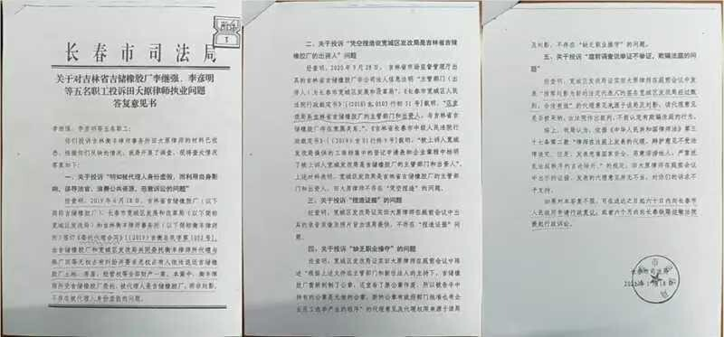 据吉林省吉储橡胶厂职工提供的材料显示,吉林衡丰律师事务所主任、吉林省律师协会会长田大原涉嫌与长春市宽城区发改局局长郭中凡、副局长纪勇等人合谋,通过提交伪造的企业主体资格对在职职工提起虚假诉讼,相关司法程序更被指为存在严重程序违法。