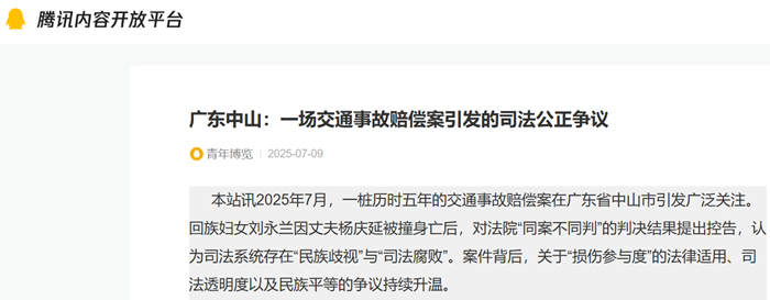 本站讯 2025年7月,一桩历时五年的交通事故赔偿案在广东省中山市引发广泛关注。回族妇女刘永兰因丈夫杨庆延被撞身亡后,对法院“同案不同判”的判决结果提出控告,认为司法系统存在“民族歧视”与“司法腐败”。案件背后,关于“损伤参与度”的法律适用、司法透明度以及民族平等的争议持续升温。