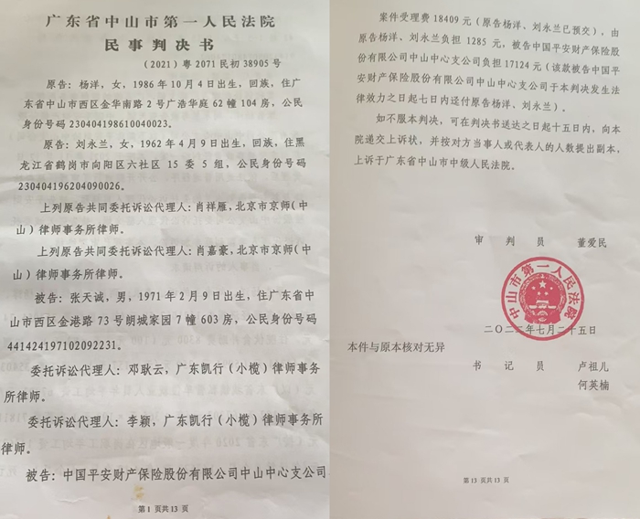 据相关法律文书记载:2020年12月18日,黑龙江人杨庆延在广东中山遭遇车祸,交警认定肇事司机张天诚负全责,杨庆延无责。2021年9月,杨庆延因伤重不治身亡。司法鉴定显示,其冠心病、高血压等基础疾病与死亡存在关联性,但明确外伤为直接死因。