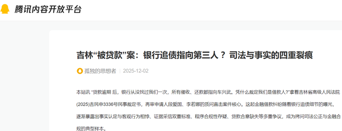 本站讯 “贷款逾期 后,银行从没找过我们一次,所有催收、还款都指向车兴武。凭什么裁定我们是借款人?”拿着吉林省高级人民法院(2025)吉民申3336号民事裁定书,再审申请人段爱国、李若娜的质问直击案件核心。这起金融借款纠纷随着银行追债细节的曝光,逐渐暴露出事实认定与客观行为相悖、证据采信双重标准、程序合规性存疑、贷款合意缺失等多重争议,成为拷问司法公正与金融合规的典型样本。