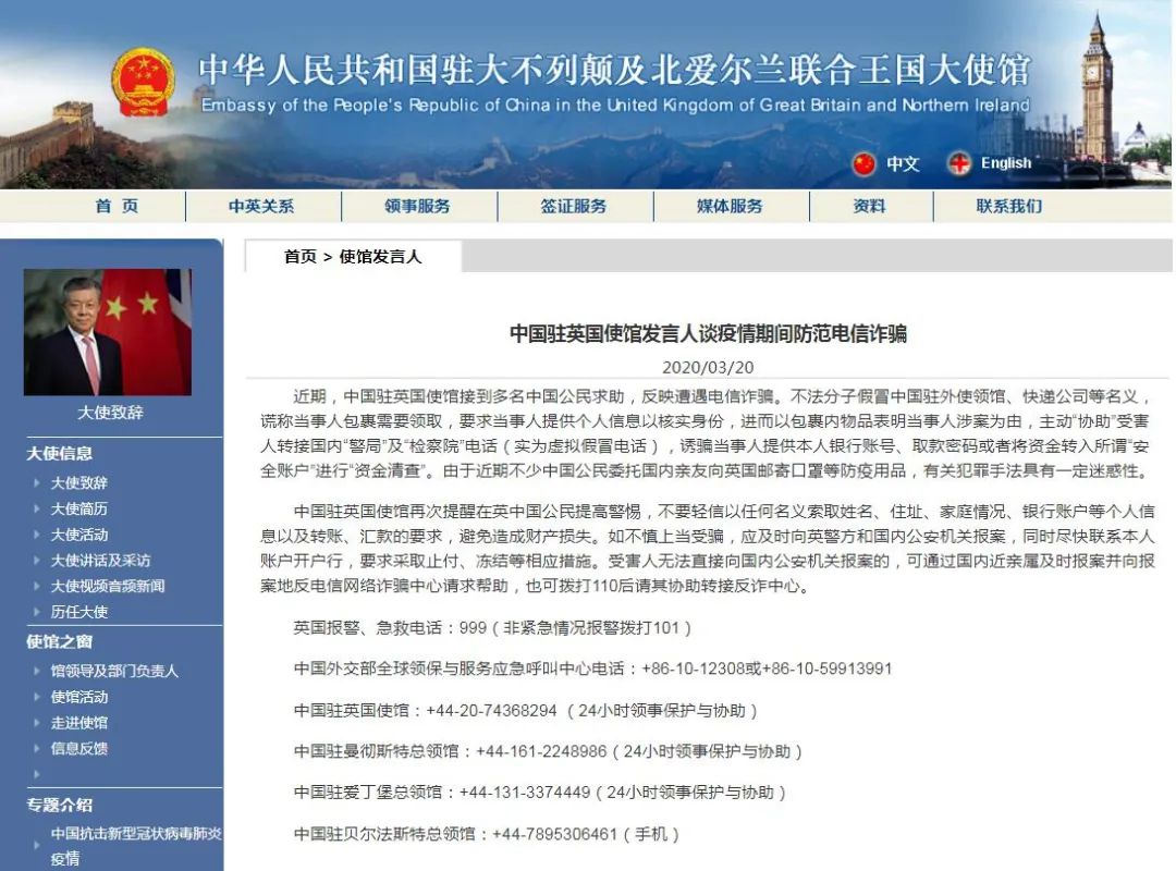 中国驻英国使馆发言人谈疫情期间防范电信诈骗