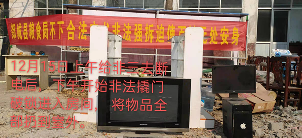 12月15日下午,马玉石、孙长江、张学房带领8人、一台挖掘机,将我家养的狗抓住后,就强行拆除了后面两间房屋,同时对前院进行非法强行撬门破锁,并非法进入房间将物品全部扔到院内(供电局可证明)。