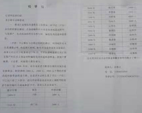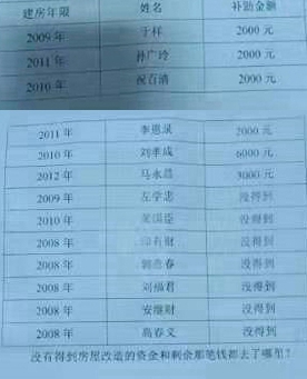 自2008年后,还有许多老百姓没有得到房屋改造补助资金,即使得到1000元2000元3000 元不等的房屋改造补助资金的老百姓,也是多次去村上找了书记,卢信书记也只给了少部分,给付的补助金也没有按正规程序转到老百姓的银行卡或低补折子中。
