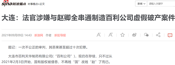 自2019年开始,在辽宁省大连市中级人民法院(“大连中院”)主导下,经过大刀阔斧的变革,百利公司破产重整,全新的思路,成功的试点,媒体盛赞以任延光、曲强、高明伟为代表的大连中院主动干事、担当作为的基础上,在深度博取了吃瓜群众的眼球后,百利公司原总经理赵卿全涉嫌十一宗犯罪并与大连中院院长、法官恶意串通将国企参股的百利公司虚假破产、侵吞国有资产数亿元的恶劣行径,也渐渐浮出水面。
