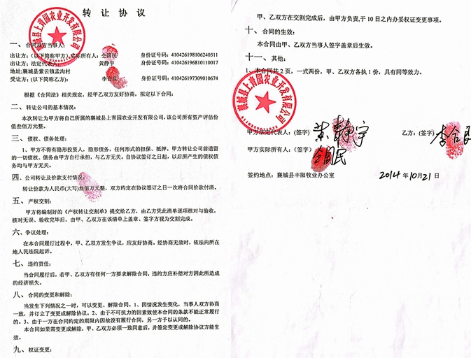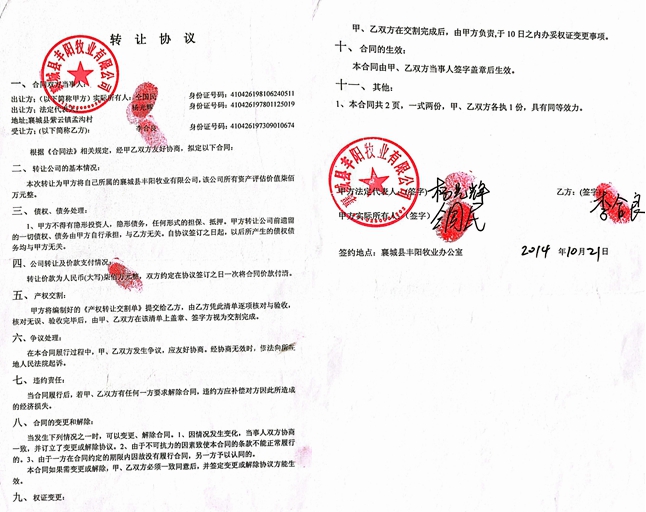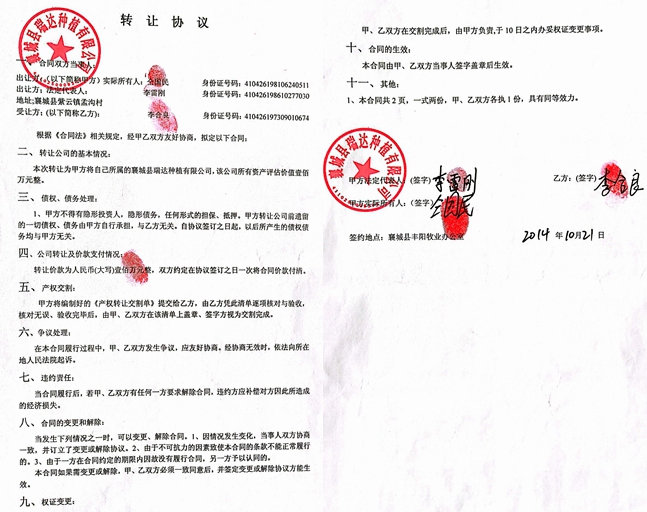 2014年10月21日,我和仝国民达成转让协议,仝国民自愿把他的羊场和果园以1100万元的价格转让给我。当时我给他二哥仝二民转了200万元,之后又分几次给他指定的人转了200万元左右(有转账凭证为证)。在我经营期间,仝国民安排他的手下打手从没有离开过羊场,羊场总共有1260只羊,经我安排的负责人李天银卖了37只病羊(是委托原羊场的兽医冯铁柱卖的),共计卖了3.7万元,以替仝国民还了拖欠冯铁柱和其他工人三个月的工资。仝国民曾多次指使手下打手黄书峰和杨林波从羊场往外拉羊,从来没有算过账,也不给钱,除了他手下打手拉走的羊之外,剩下的全部都被仝国民委托王明朝(现住襄城县十里铺镇鲁堂村)卖到外地了,什么价格卖的,多少钱也不告诉我。因为他势力大,我们周边这些人没有不怕他的,见到他就像见到恶魔一样,我们敢怒不敢言,每天都忍气吞声,我也不敢问,我看在这里,已是无法正常营业了,就不干了。到后来,仝国民又把羊场租给别人,做违法的生意,被举报政府知道这件事,被政府出面制止了违法行为,到至今厂里还有当时他建好的用于做违法生意的水泥池子和挖好的大坑(有照片为证),我花了几百万元,到现在就连到羊场看看的资格都没有了。7月份有人想租羊场,我还想跟仝国民商量该怎么办时,我走到羊场门口儿,看门儿的老王(王二娃)说;别人来进去可以,唯独你来了得经过老板(仝国民)同意才能让你进去。事实经过就是这样,我花了几百万连进去的资格都没有,可见村霸仝国民所作所为触目惊心。对以上事实 恳请公安机关立案调查。