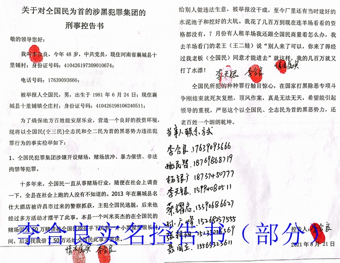 几年来我一直走在上访的路上,我曾经写过无数封信上告举报信,对以仝国民为首的黑社会犯罪赌博集团进行举报,都石沉大海一直没有得到解决。