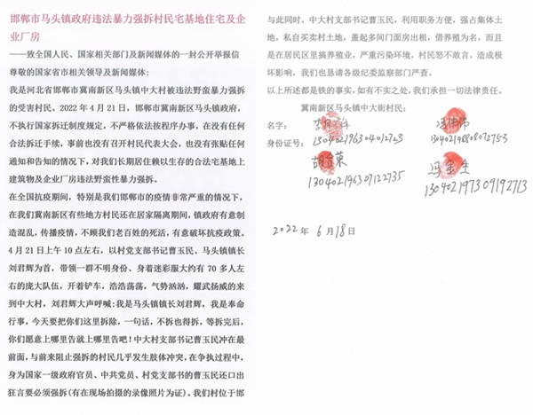 我是河北省邯郸市冀南新区马头镇中大村被违法野蛮暴力强拆的受害村民。2022年4月21日,邯郸市冀南新区马头镇政府,不执行国家拆迁制度规定,不严格依法按程序办事,在没有任何合法拆迁手续,事前也没有召开村民代表大会,也没有张贴任何通知和告知的情况下,对我们长期居住赖以生存的合法宅基地上建筑物及企业厂房违法野蛮性暴力强拆。
