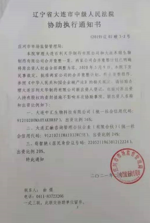 2021年2月3日,大连中院作出(2019)辽02破3-2号协助执行通知书,称“百利公司和禾甜公司合并重整一案,重整计划将原出资人权益调整为零,2020年5月9日,本院下发民事裁定,批准两家公司的合并重整计划”,要求庄河市市场监督管理局协助将百利公司的出资人变更为大连中汇生物科技有限公司(以下简称“中汇公司”)、大连汇融咨询管理合伙企业(有限合伙)(以下简称“汇融咨询”)和荀**,并称“此前对原出资人持有股权的查封措施不影响本次协助事项”。