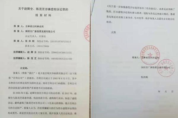 2019年4月中旬,白河林业局工作人员接到百利公司注册股东杜汶彦(已逝)的举报材料,前去大连中院找到办案法官任延光、曲强,以赵卿全股权的获得涉嫌刑事犯罪为由要求大连中院中止破产程序,被任延光、曲强拒绝。