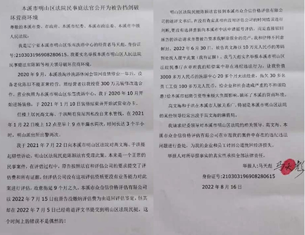 我是辽宁省本溪市明山区乐雪洗浴中心的经营者马天彪,身份证号:210303196908280615。我要实名举报本溪市明山区人民法院民事庭法官陈颖等相关领导破坏营商环境。