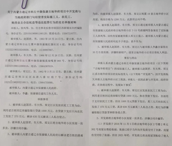 举报人系内蒙古通辽市科左中旗保康吉地华府项目(以下简称“吉地华府项目”)的实际施工人,被举报人赵国君、车大伟、郑文江系吉地华府项目的实际投资人(以下简称“开发商”)。因开发商拖欠举报人吉地华府小区工程款,举报人一直因此事与开发商、政府协商,在协商过程中,发现如下事实:
