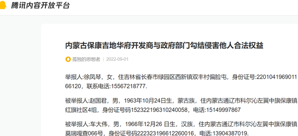 举报人:徐凤琴,女,住吉林省长春市绿园区西新镇双丰村偏脸屯,身份证号:220104196901166120,联系电话:15567218777.