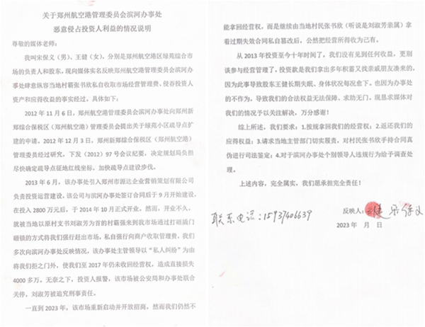 郑州航空港管理委员会滨河办事处恶意侵占投资人利益的情况说明