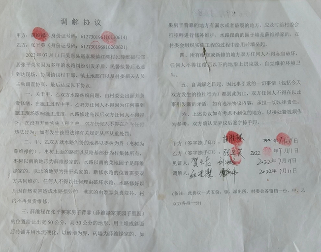 2022年7月11号,我的邻居薛维禄故意在我家房子背后挖开洞,用水泵、水管往我房子里放了3尺多高的水。我发现后第一时间向寇家塬镇政府镇长张彦霞、派出所、村负责人反映问题,为首的是镇长张彦霞、贺云龙所长、乡镇土地员霍胜利等人。当天,在镇长张彦霞、贺云龙所长等人的调解下,我和薛维禄达成调解协议,但事后,薛维禄并未兑现双方达成的协议,我只好继续到处告状。