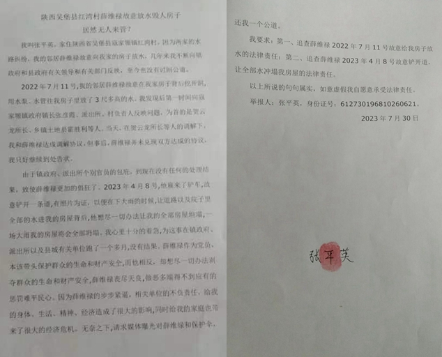 我叫张平英,家住陕西省吴堡县寇家塬镇红湾村。因为两家多年的水路纠纷,我的邻居薛维禄故意向我家的房子放水,几年来我不断向镇政府和县政府有关领导和有关部门反映,至今也没有讨回公道。