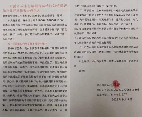我的孩子只有8岁,目前孩子已经受到了惊吓,小小的心灵受到了创伤,不敢上学了。尊敬的各位领导,我赵紫涵本人没有违法犯罪,是受禾丰银行高利息的压榨,为了还银行的高额利息我拖欠工程款300多万、员工工资300多万、物业电费20多万,这些欠款都在明山区法院执行局备案的,难道明山区法院执行局法官还有主管领导不懂法吗?我期望相关领导,给我这个弱女子做主,如果没有结果我会层层上告,并寻求媒体曝光,让所有人看看本溪市明山区法院执行局目无王法的嘴脸,如果不是明山法院执行局某领导与禾丰村镇银行有勾结,暗箱操作、徇私舞弊,就凭一个小法官怎么会以身试法!