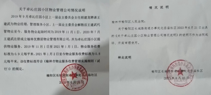 交纳小区物业费事关全体业主的共同利益,王建武在起诉部分业主交纳物业费时,北岳庙社区主任冯晓东多次出具情况说明,用来证明完全不同的事实。2023年6月21日,榆阳区长城路街道办事处北岳庙社区出具<关于卓沁庄园小区物业管理公司情况说明>:2019年9月卓沁庄园小区上一届业主委员会主任胡建龙聘请王建武为物业经理,管理服务小区。上一届业主委员会解散后王建武代管物业至今,服务物业起始时间为2019年11月1日。2020年7月王建武注册成立榆林优雅居物业管理有限公司,并为卓沁庄园小区提供物业服务。然而在2023年8月22日再次出具情况说明,意在说明关于榆阳区长城路街道办事处北岳庙社区2023年6月21日出具的<关于卓沁庄园小区物业管理公司情况说明>的说明不作为法院起诉、开庭审理使用。前后矛盾,一边出具情况说明,认可王建武及优雅居物业管理有限公司管理服务卓沁庄园小区,一边和梁郡、胡建龙等人相勾结,出具证明之前开过的认可王建武管理卓沁庄园小区的证明无效。社区公章本该代表社区全体居民的共同利益,然而在北岳庙社区的领导眼中无关轻重,只要收取一些贿赂或是其他非法原因,均可以抛开事实,违法盖章,视社区全体居民的利益为儿戏。社区的此种违法行为,是导致卓沁庄园小区业主矛盾不断升级,小区管理严重混乱的主要原因。