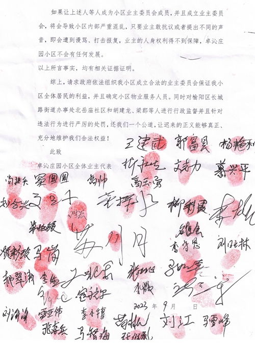 我们是陕西省榆林市榆阳区二里半卓沁庄园小区的业主及各楼的楼长,由于我们的小区物业服务管理混乱,社区违法作为、违法不作为、出具多份“阴阳证明”,以及部分业主的行为甚至已经危害到了我们的人身权利,因此现将卓沁庄园小区的现状、榆阳区长城路街道办事处北岳庙社区的违法行为,以及胡建龙、梁郡等人的违法情况进行说明,望贵单位依法监督,并请政府及其有关部门组织我小区依法成立业主委员会、确定物业服务公司、对违法相关机构及人员进行行政监督以及处罚。