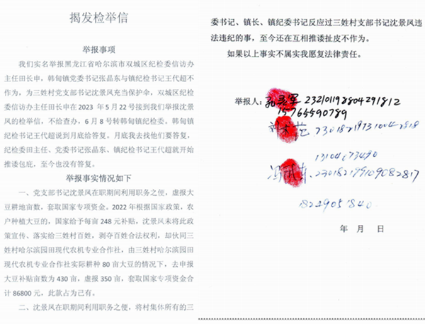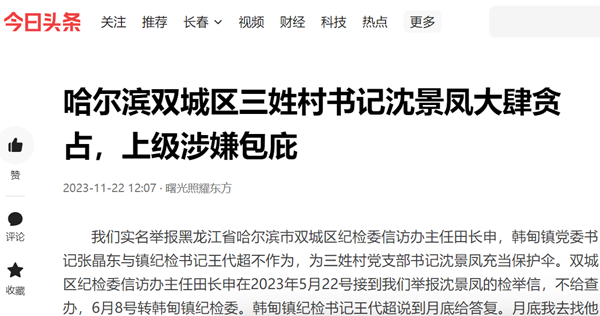 对于沈景凤的以上问题,我们曾多次到双城区纪检委田长申主任、韩甸镇党委书记、镇长、镇纪委书记处反应,但这些人至今还在互相推诿扯皮不作为。