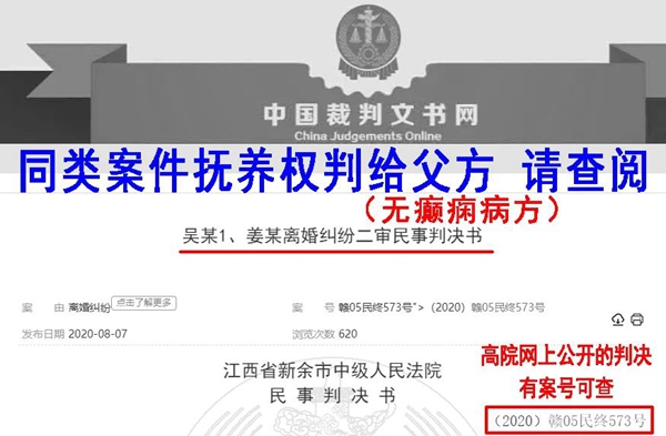 我到法律裁判文书网搜索癫痫病查到和我情况相同的判决,孩子在哺乳期的、双方有两个孩子的,都判给无癫痫病男方,而张艳伟法官的一审判决书中只字不提癫痫病,以患有疾病代替(网上公开的判决书中都写癫痫病,不涉及保护隐私,自学法律后我明白了原因),判决书结尾“本院认为”部分没有引用法条,却引用女方刘某(律师代说)“(刘某)自认为(患有的癫痫病)不影响抚育孩子”为依据将孩子判给女方抚养。
