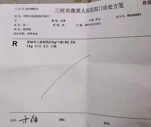 11:30左右,于佳大夫给姜兴德以一个叫“张一”的名字开了门诊处方,内容是“2瓶聚磺苯乙烯纳散”,并让患者家属下楼到门诊购买该药。