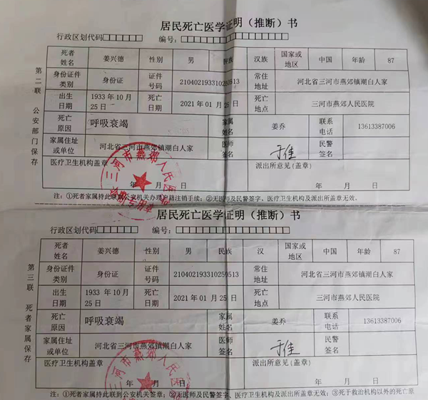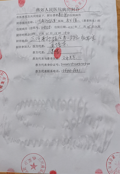 至此,姜兴德先生永远离开了这个世界,处理完后事一段时间后,全家人平静下来,才发现其父亲在三河市燕郊人民医院的治疗过程存在严重问题: