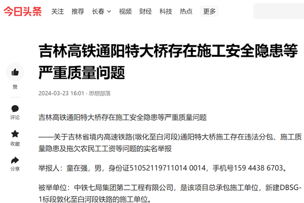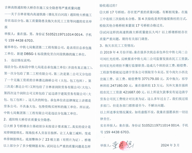 ——关于吉林省境内高速铁路(墩化至白河段)通阳特大桥施工存在违法分包、施工质量隐患及拖欠农民工工资等问题的实名举报