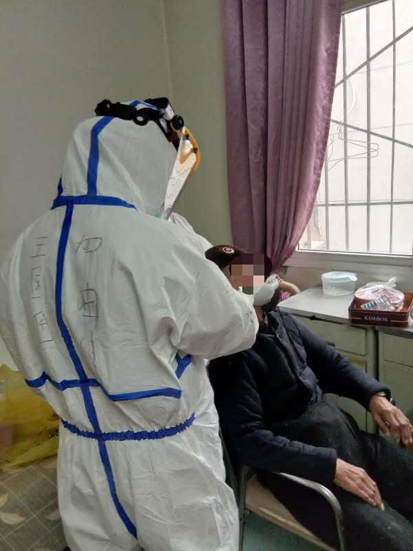 王园园在养老院为老人做咽拭子采样。受访者供图