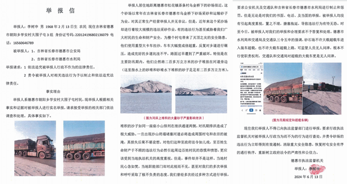 ——关于吉林省德惠市松花江镇茶条村乌金桥下的砂场严重超载问题的举报信