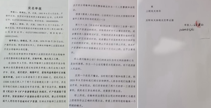 在2024年4月份,榆神分局民警徐小龙通过电话联系举报人去他工地开铲车、进行挖沙、倒煤研石、获取利益,将煤矸石回填。当时,他口头承诺每月给我工资为9500元。可是,我干了两个月后徐小龙工资一分不付,并且告诉我们他的工地就没有开采手续,属于非法开采。根据我国《宪法》和《矿产资源管理法》的规定,矿产资源属于国家所有,国家保障矿产资源的合理开发利用,禁止任何组织或个人用任何手段破坏矿产资源。而神木市榆神工业园区经开发分局榆神分局民警徐小龙作为一个人民警察知法犯法。